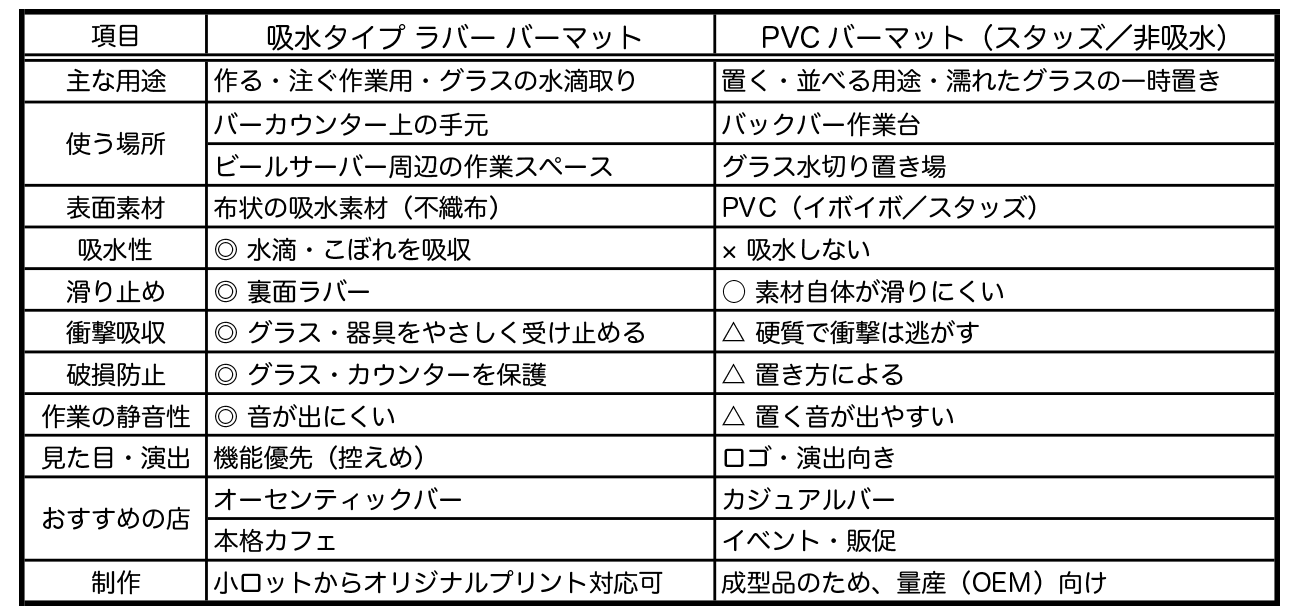 用途によって、適したバーマットは異なります。